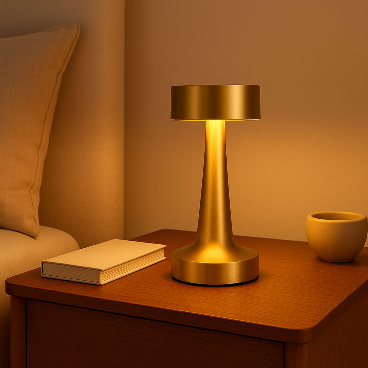 Lampara de Mesa Lampara de Mesa Diseño: Cilindro Diseño elegante con acabado metálico 3 niveles de iluminación: cálida, neutra y fría Batería recargable de larga duración